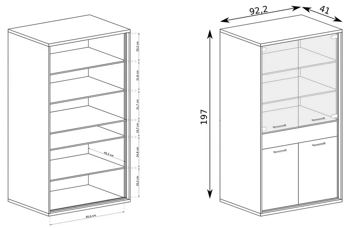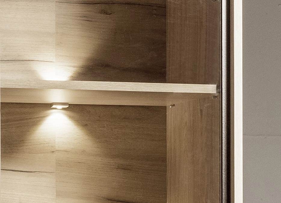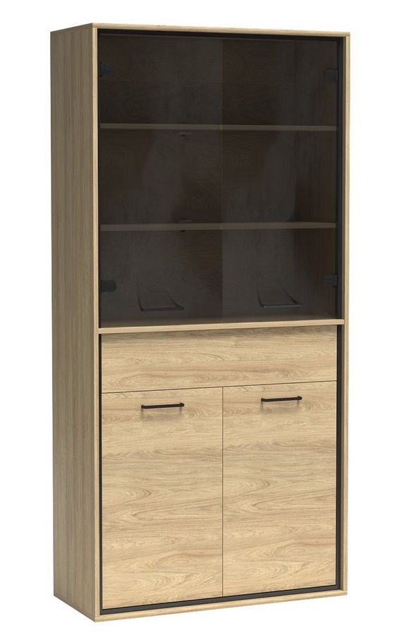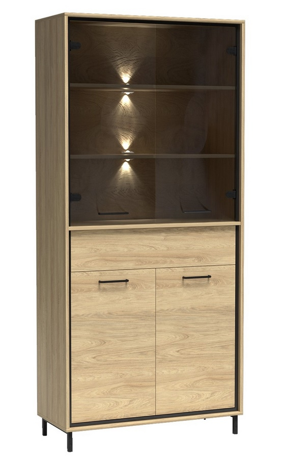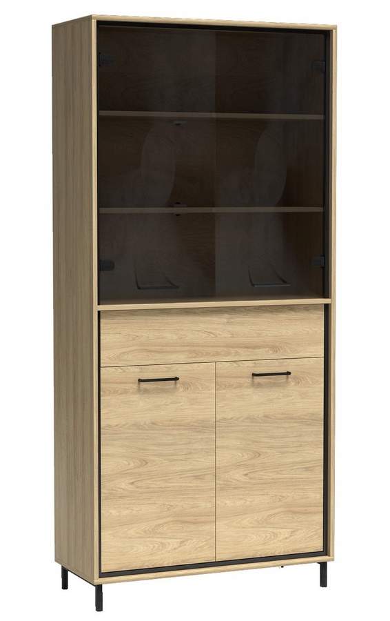 Vitrína čtyřdveřová se zásuvkou ze sektorové řady doplněna prvky v černé barvě. Zásuvka je doplněna dekorační dubovou deskou a systémem push to open - otvírání zmáčknutím zásuvky. LED osvětlení není v ceně. Barva: dub hickory Rozměry (šxvxh): 92,2 x 197 x 41 cm Materiál: kvalitní lamino ohraněné ABS páskou/sklo Úchyty: kov Dodáváno v demontu.