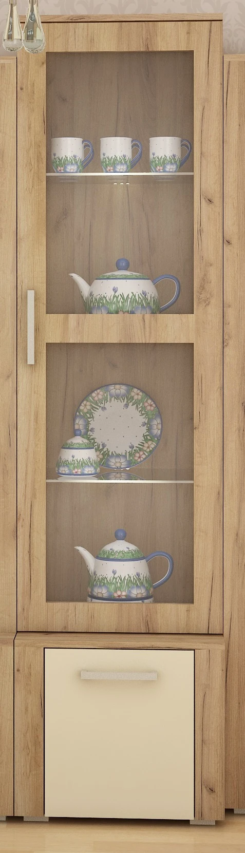 Policová vitrína Barva: craft zlatý/krém/craft zlatý - dekory jsou uvedeny v pořadí korpus/dvířka/boční lišty Materiál: lamino 26 mm Rozměry (šxvxhl): 50 x 295 x 48 cm Madla dvířek jsou vyrobeny