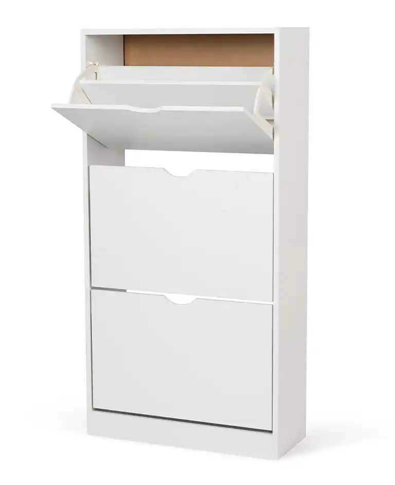 Botník s kompaktním a úzkým designem, ideální do menších prostor. Tři výklopné úložné prostory pro obuv. Jednoduché otevírání pomocí výřezů místo úchytek. Stabilní konstrukce pro každodenní používání.
