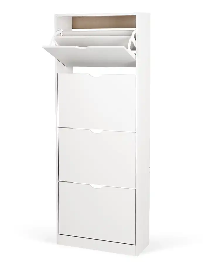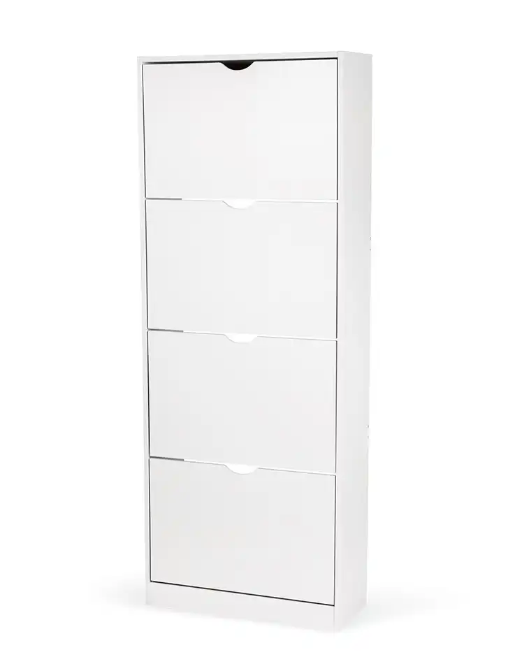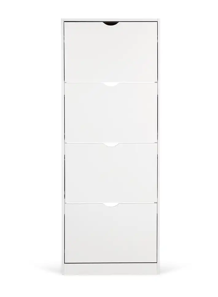 Botník s kompaktním a úzkým designem, ideální do menších prostor. Čtyři výklopné úložné prostory pro obuv. Jednoduché otevírání pomocí výřezů místo úchytek. Stabilní konstrukce pro každodenní používání.