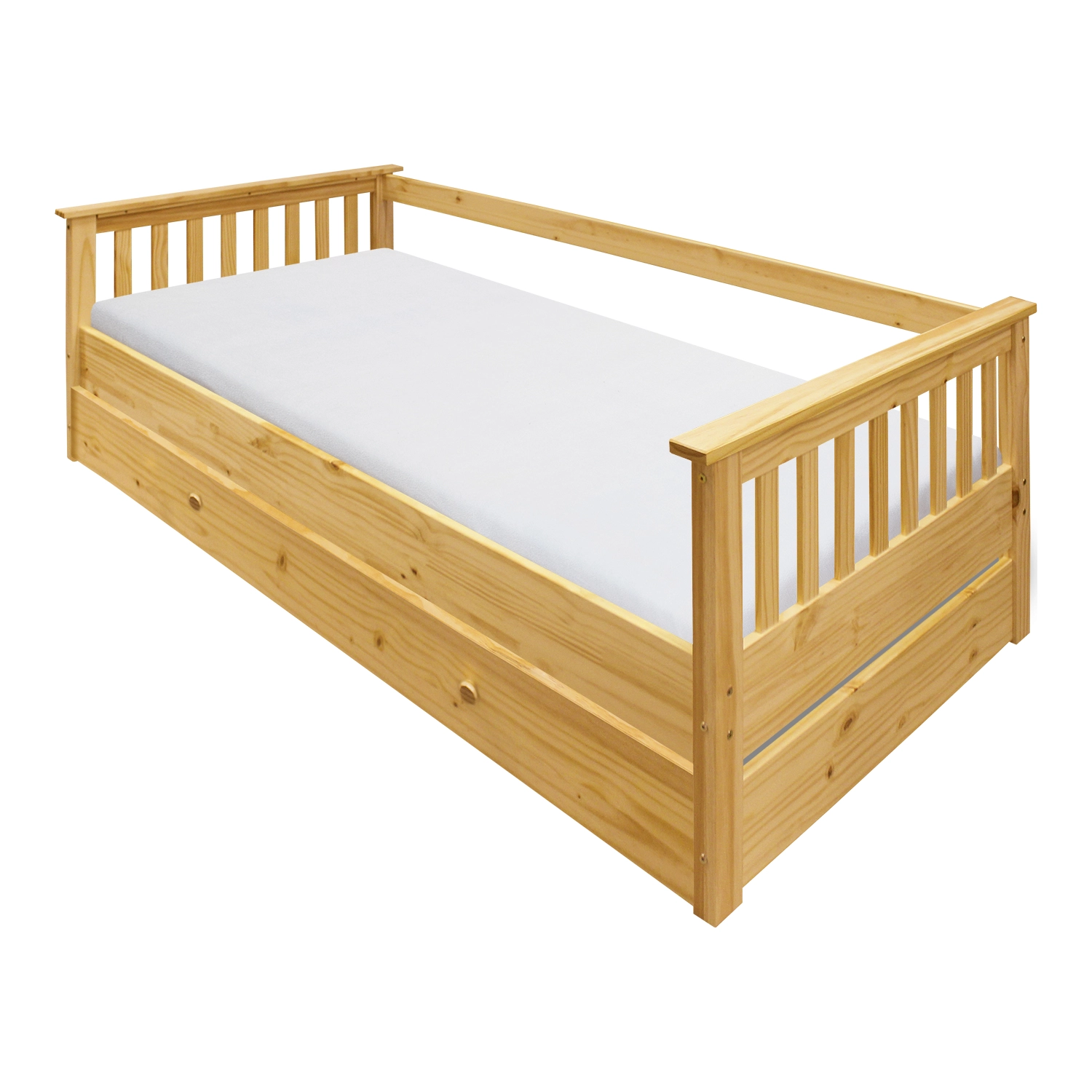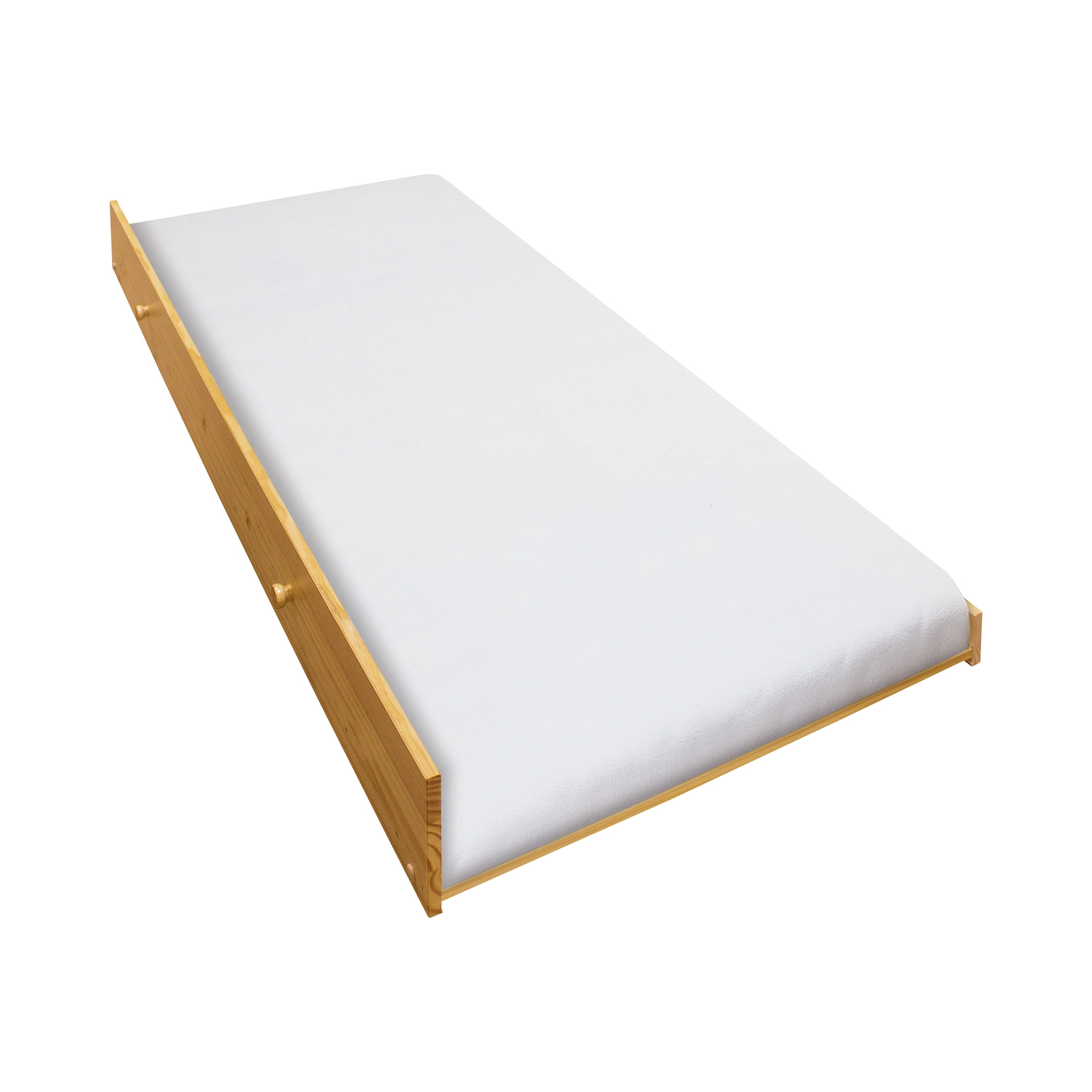 Výsuvná postel na kolečkách z borovicového dřeva.