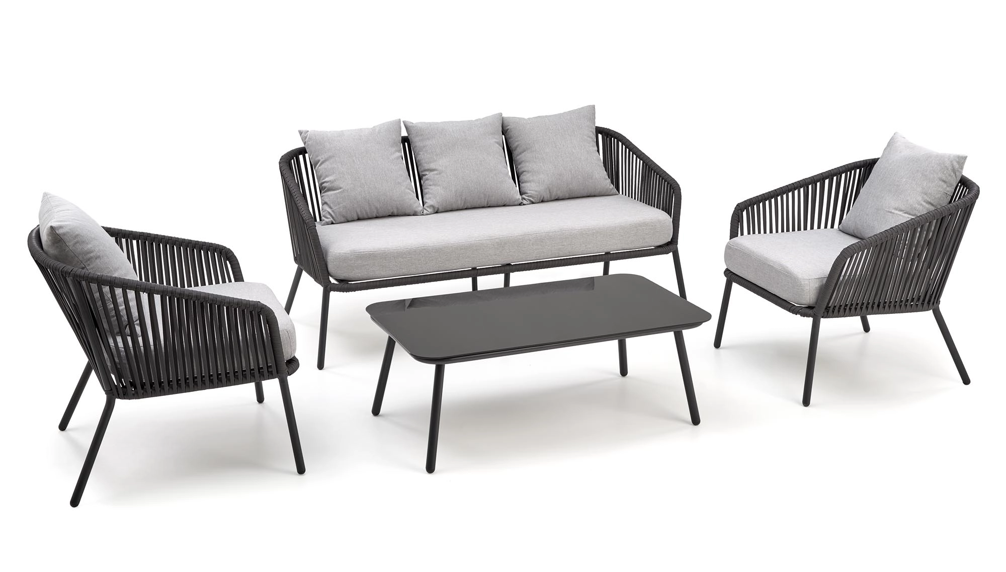 Sestava obsahuje trojsedák, dvě křesla a konferenční stolek