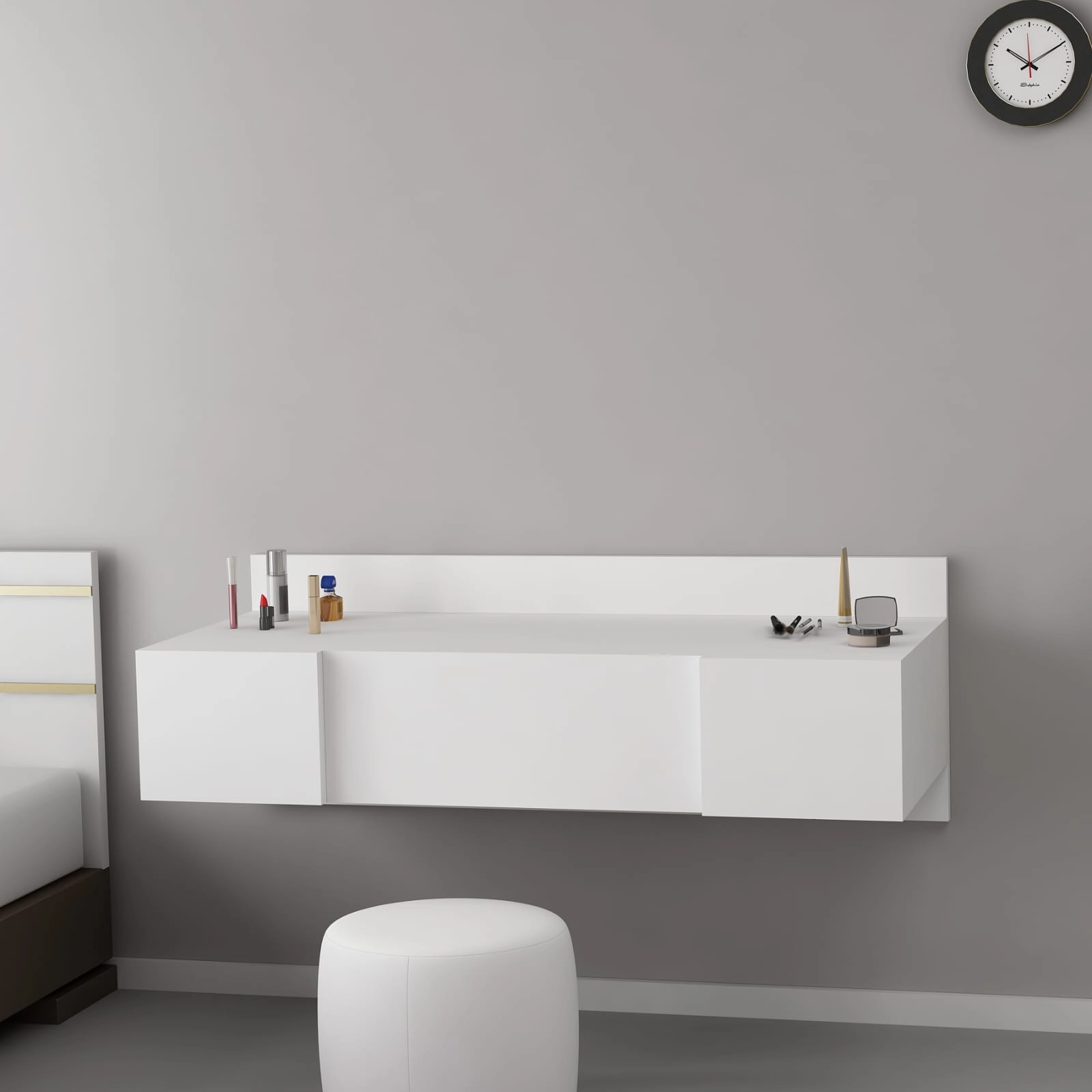 Technické detaily:Materiál: Materiál: 100% melaminovaná dřevotřískaTloušťka: 18 mmRozměry kosmetického stolku: Šířka: 100 cm, výška: 33 cm, hloubka: 39. 1 cm.Velikost zrcadla: 1,5 cm: Šířka: 49. 6cmZrcadlo