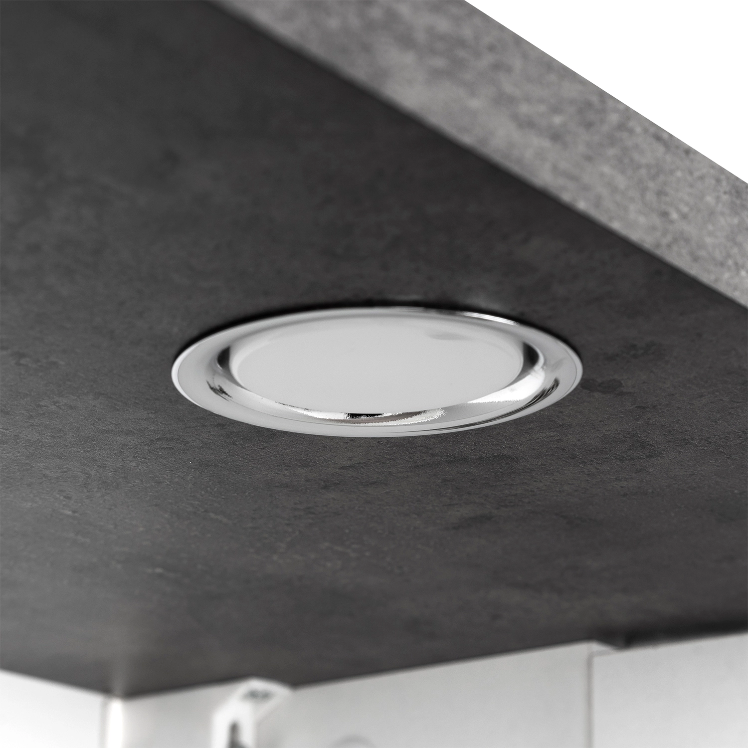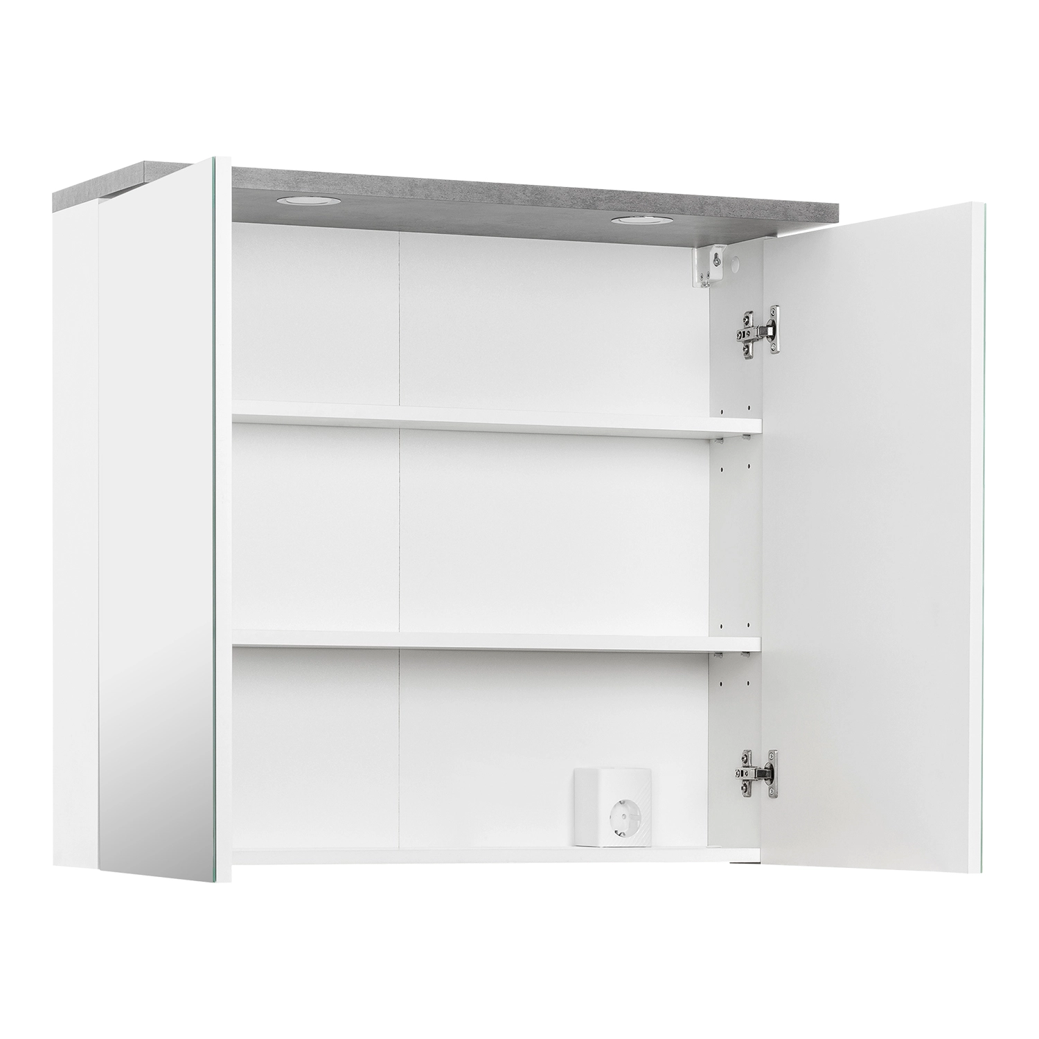 Závěsná skříňkaMateriál: laminoBarva: bílá/imitace tmavého betonu- 2 dvířka se zrcadly, 2 police v horní části skříňky 2 světla, uvnitř skříňky el. zásuvkaRozměry (šxvxh): 79 x 71 x 28 cmDodáváno v de