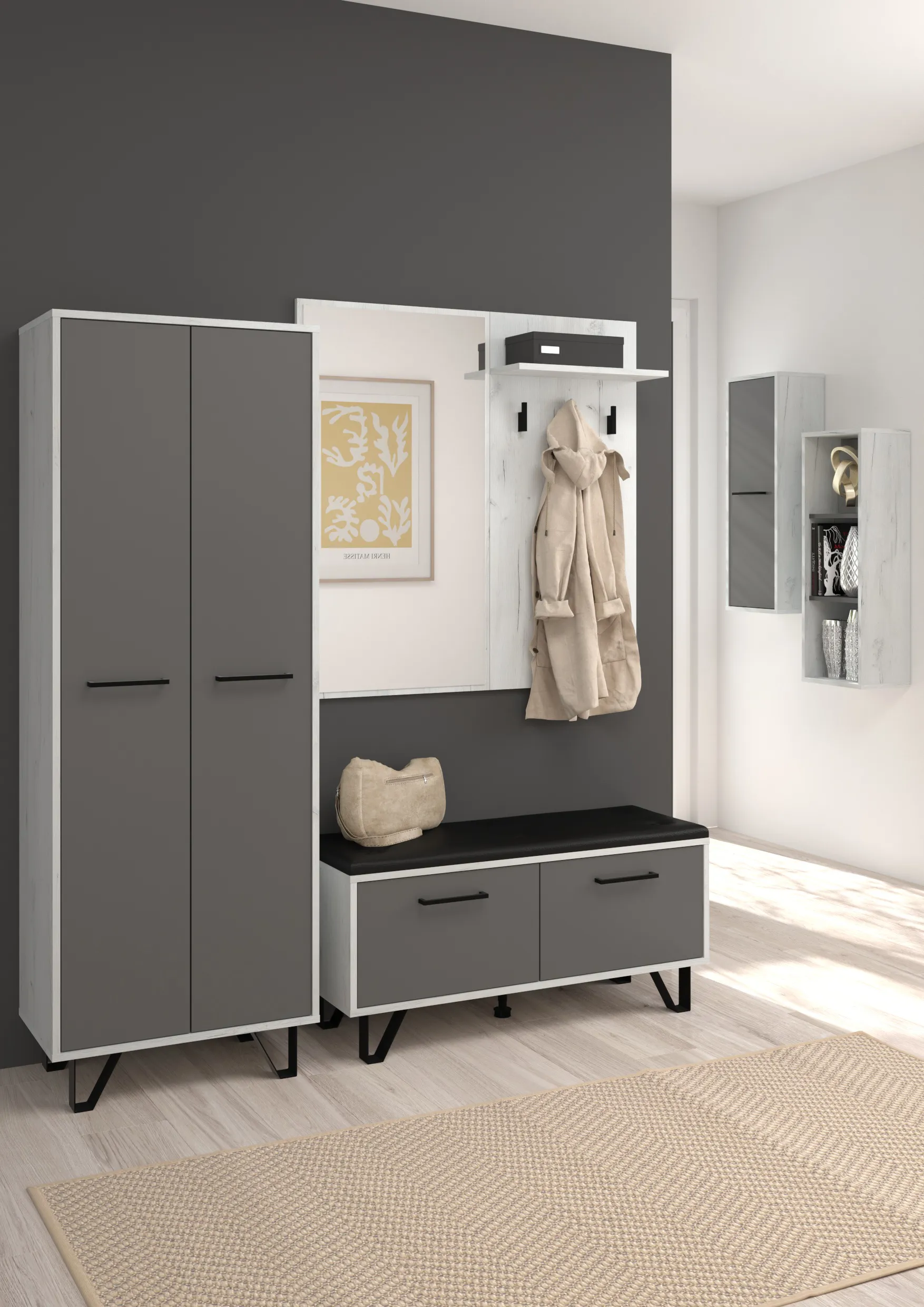Závěsná policová skříňka s dvířky Barva: - craft bílý/grafit - úchytky: černá Rozměr (šxvxh): 32 x 90 x 25 cm Materiál: lamino 16 mm, ABS hrany Disponuje systémem tichého dovírání. Dodáváno v demon
